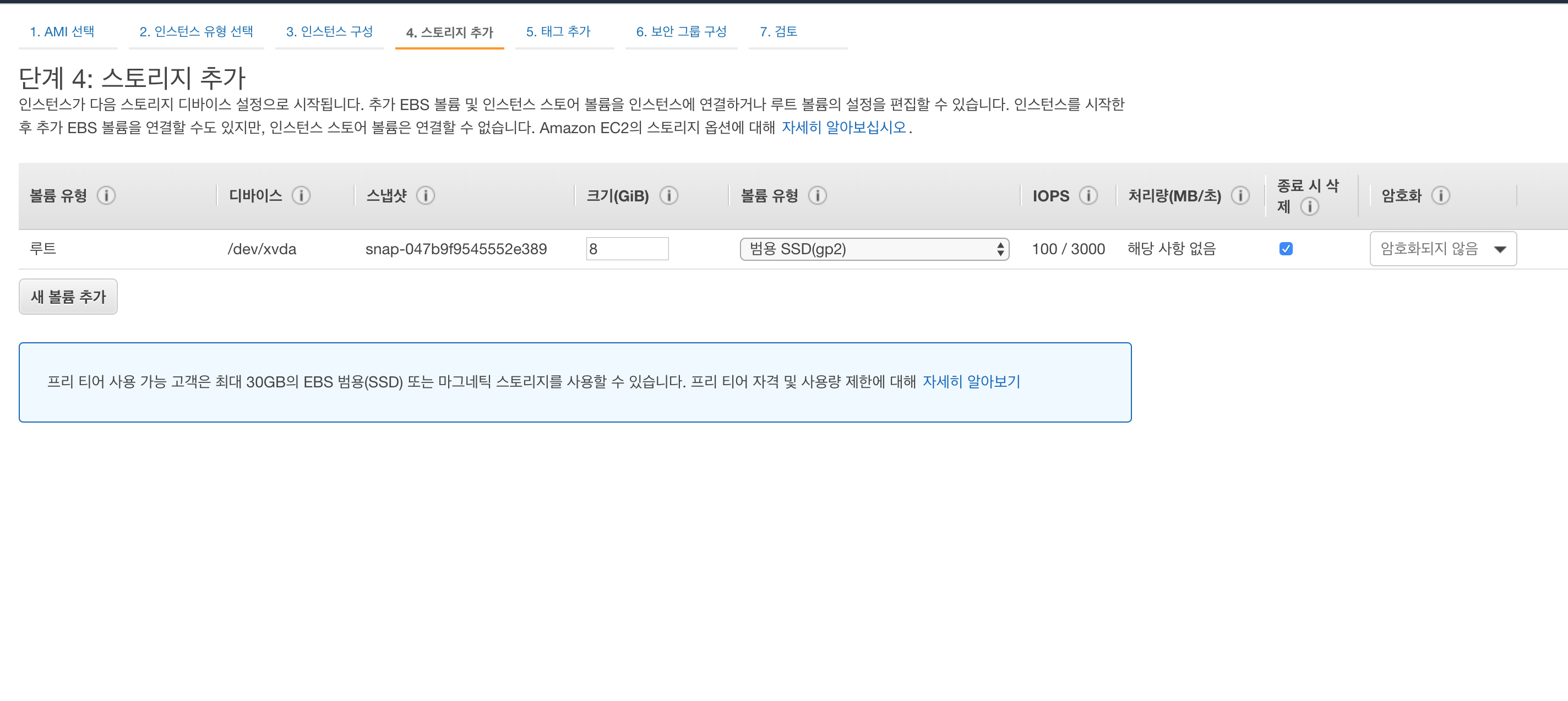 저는 인스턴스1개(8GB) 를 사용하고 있으므로 8GB 를 추가 사용하더라도 프리 티어 사용이 가능하므로 기본 셋팅인 8GB 만큼 사용하도록 하겠습니다.