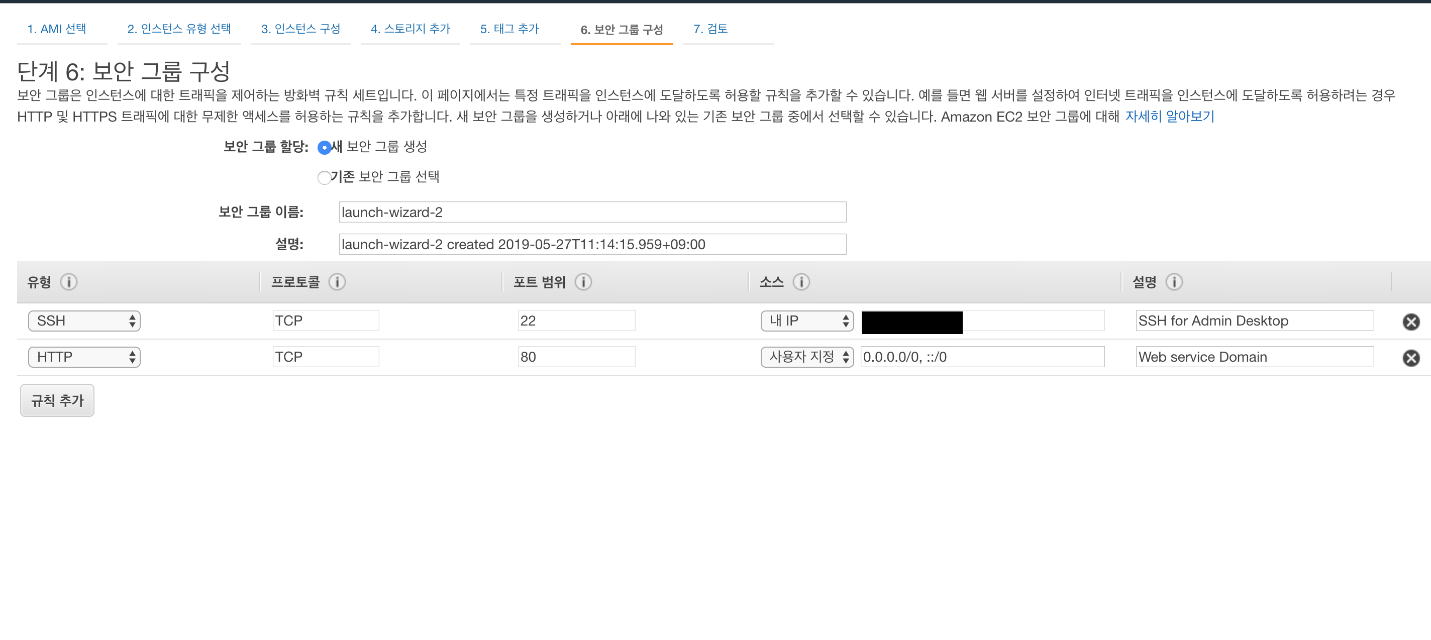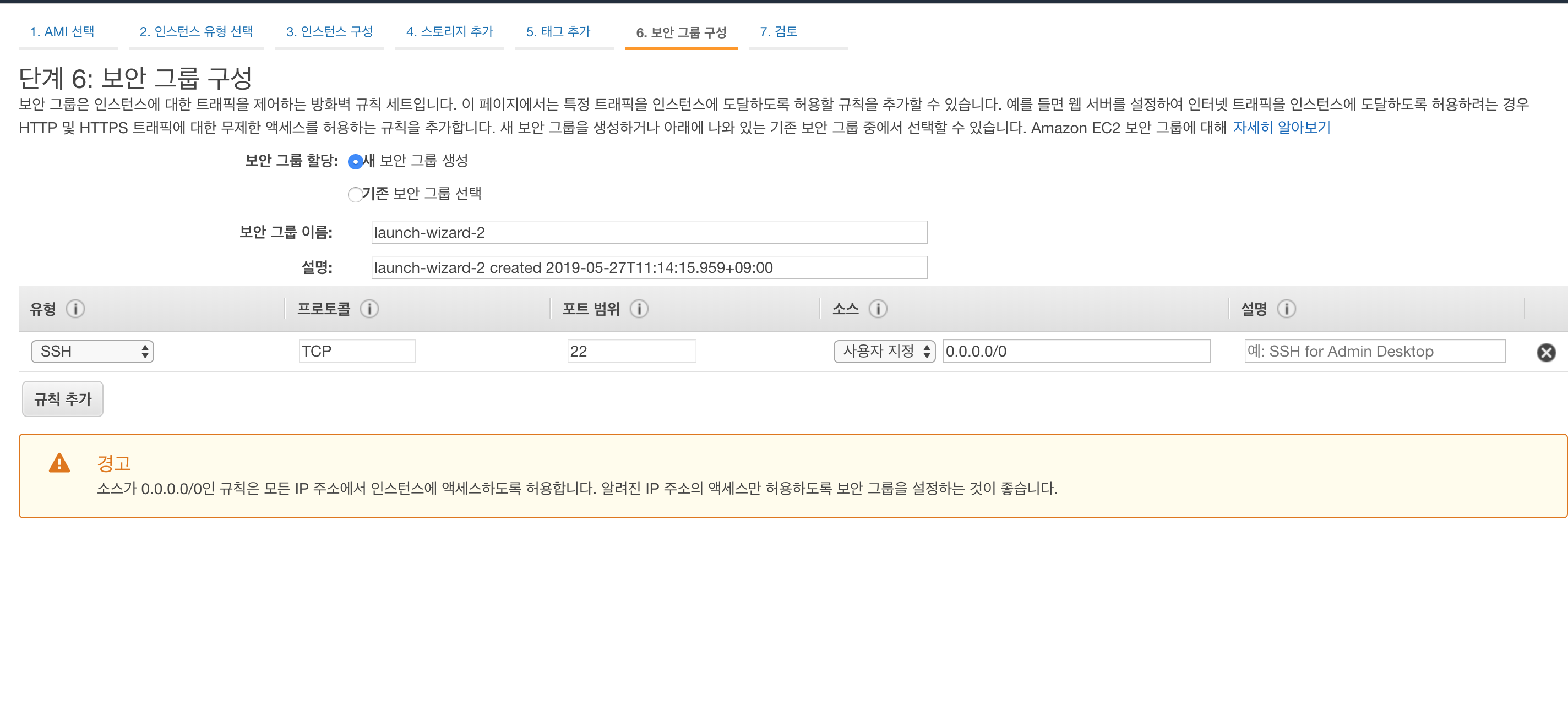 6단계 보안 그룹 구성에서의 셋팅을 통해서 방화벽 규칙을 설정합니다. 여기서 Inbound 를 허용하는 IP 와 포트 등을 설정 할 수 있습니다. 기본설정되어 있는 화면은 아래 이미지와 동일하며 기본설정 포트는 22, ip 는 모든 IP 를 허용하는 0.0.0.0 으로 설정되어 있습니다.