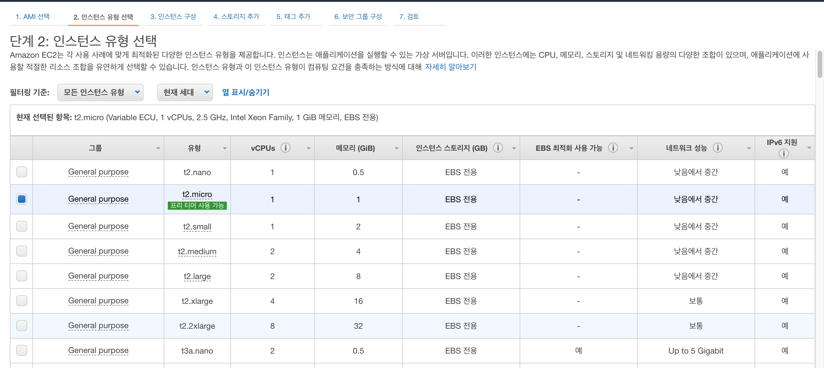 2단계 인스턴스 유형선택 에서도 프리티어 사용 가능이라고 적혀 있는 그룹을 선택하고