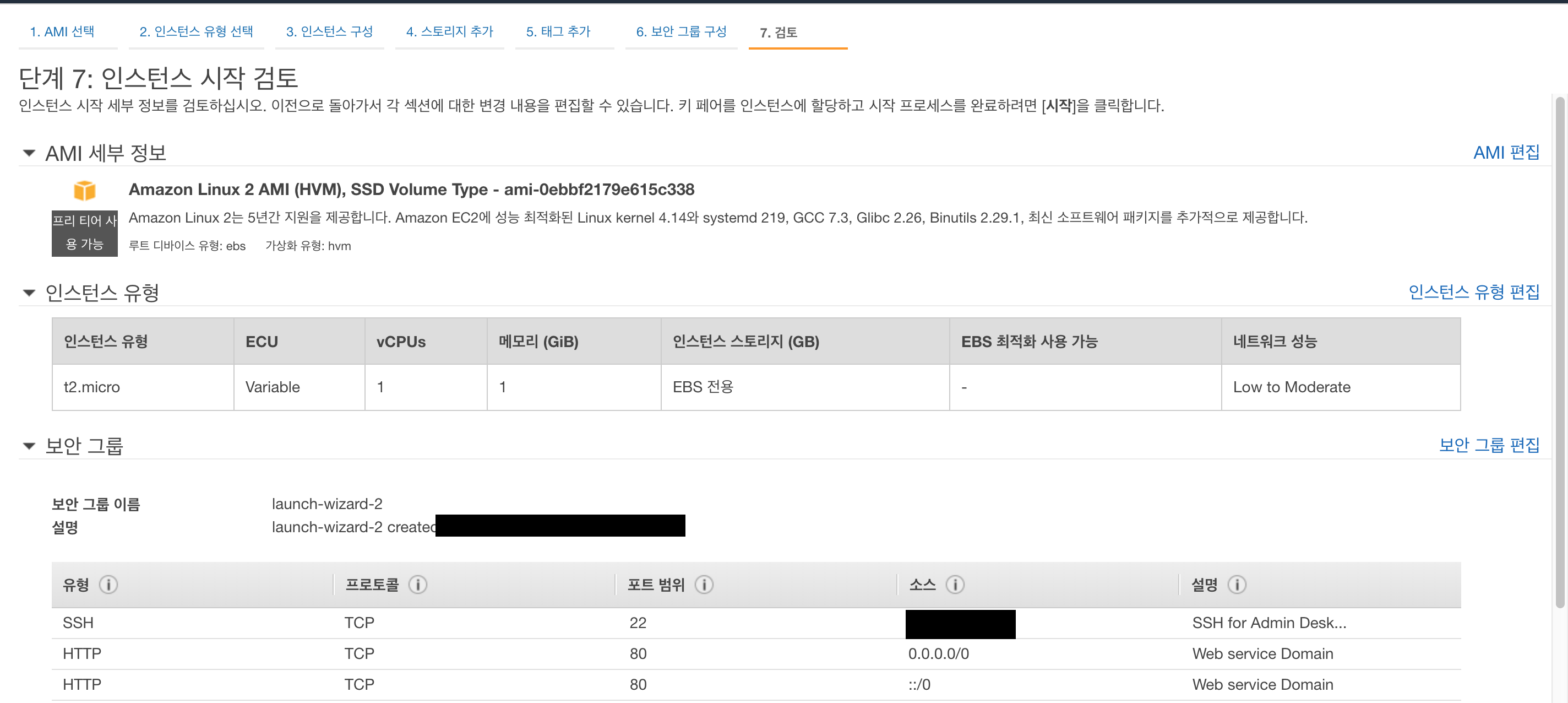 모든 보안 그룹 구성 설정을 완료하였다면 검토 및 시작 버튼을 눌러주세요. 보안그룹 설정은 추후에 추가해도 되니, 아직 그룹설정을 잘 모르겠다 하시는 분들은 기본설정 그대로 완료 하셔도 됩니다.