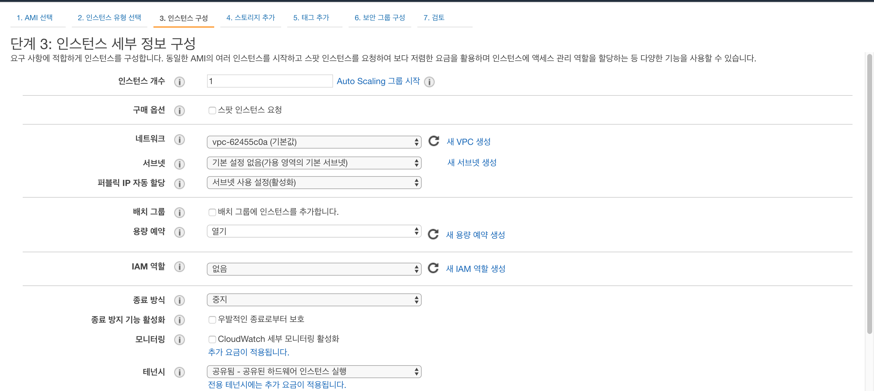 3단계 인스턴스 세부 정보 구성 선택 화면이 나옵니다. 여기에서는 인스턴스 개수, 구매옵션, 네트웤, 서브넷, 퍼블릭 IP 자동 할당 등의 다양한 옵션이 있으니 사용자의 요구사항에 맞게 설정해주시면 됩니다.