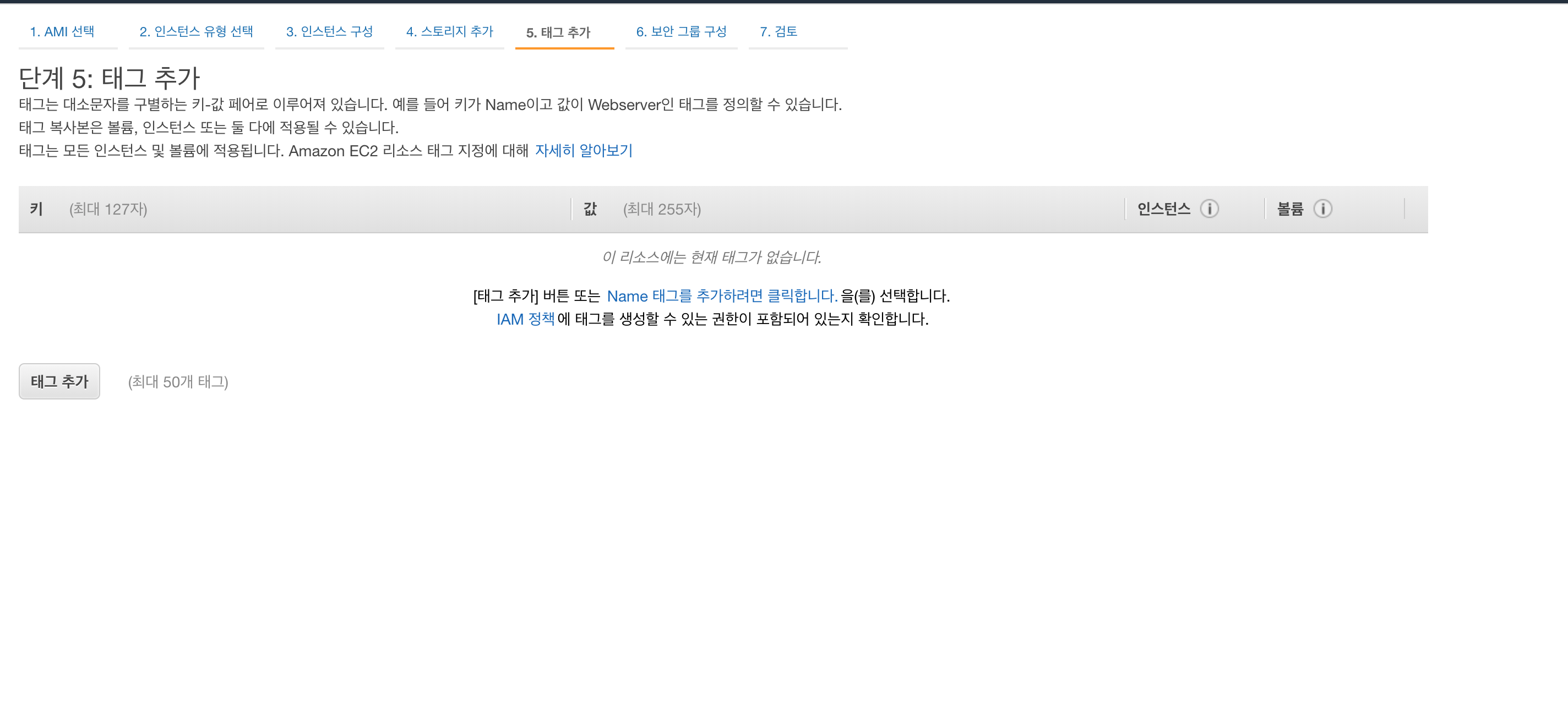 5단계 태그 추가에서는 키 - 값 을 지정할 수 있습니다. 이러한 태그를 사용하면 용도, 소유자 또는 환경 등을 기준으로 AWS 리소스를 다양한 방식으로 분류하여 관리할 수 있습니다. 원하는 용도에 맞게 태그를 추가하고 다음 버튼을 눌러주세요. (태그를 추가하지 않아도 됩니다.)