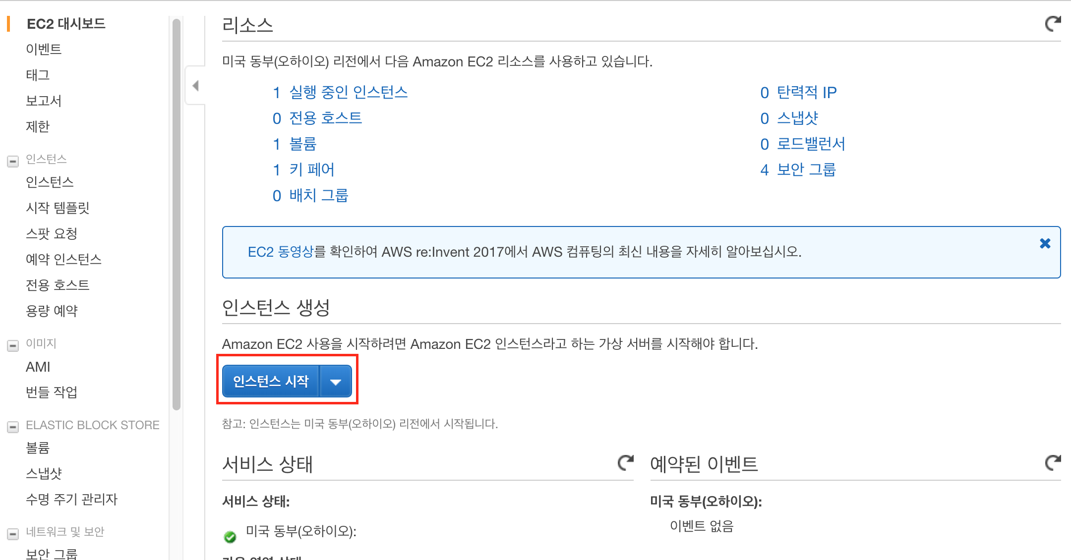 해당 메뉴로 들어가서 인스턴스 시작 버튼을 눌러줍니다.