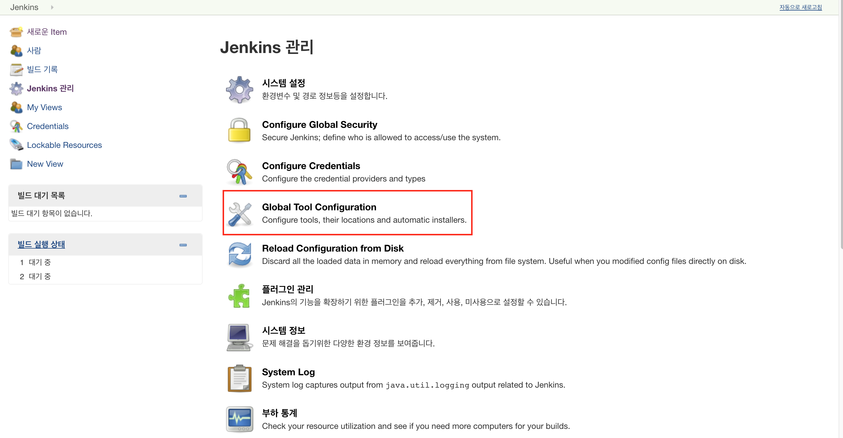 이제 배포설정을 시작하도록 하겠습니다. Jenkins 관리 > Global Tool Configuration 메뉴로 들어갑니다.