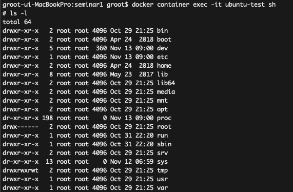 ubuntu-test 컨테이너의 shell 스크립트를 실행시켜 보기 위해 다음과 같은 명령어를 실행시켰고, ubuntu 환경에 접속한 것을 확인 할 수 있다. 디렉토리를 조회하는 ls -l 명령어를 검색했을때, 기본 ubuntu 디렉토리구조로 생성되어 있는것을 확인할 수 있다.