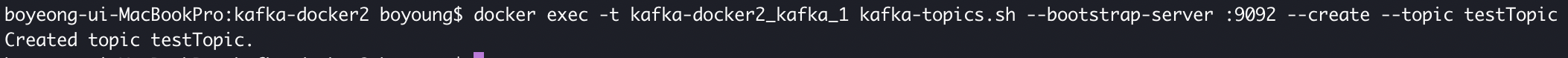 > docker exec -t {containerName} kafka-topics.sh --bootstrap-server :9092 --create --topic {생성할 Topic 명}
