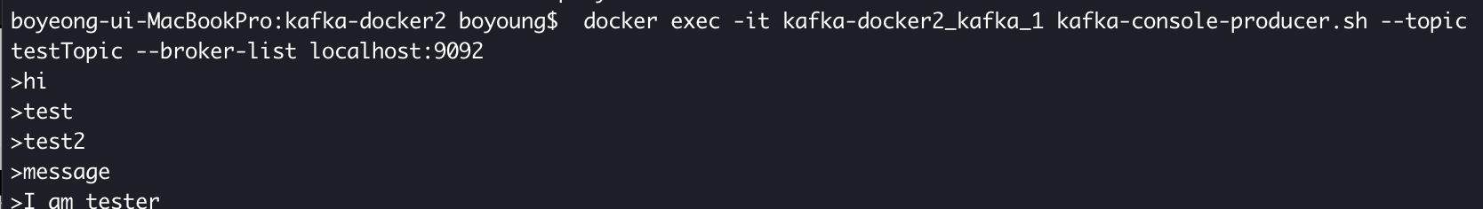 > docker exec -it kafka-docker2_kafka_1 kafka-console-producer.sh --topic testTopic --broker-list localhost:9092