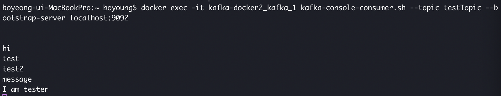 > docker exec -it kafka-docker2_kafka_1 kafka-console-consumer.sh --topic testTopic --bootstrap-server localhost:9092